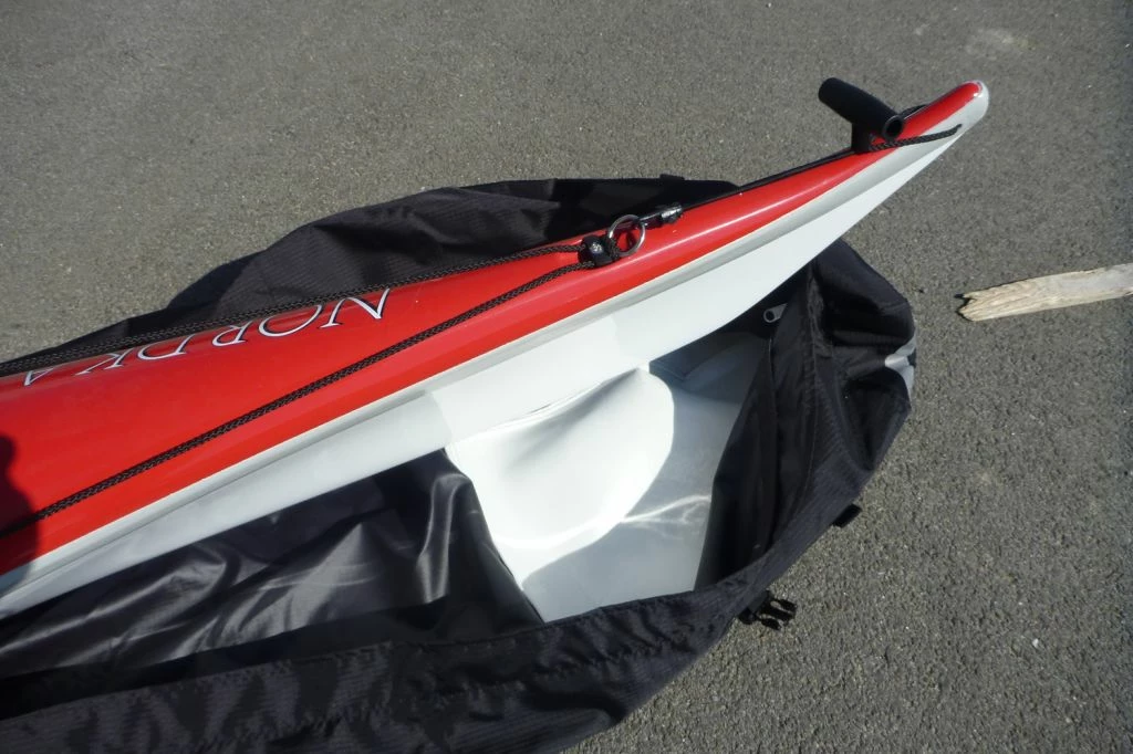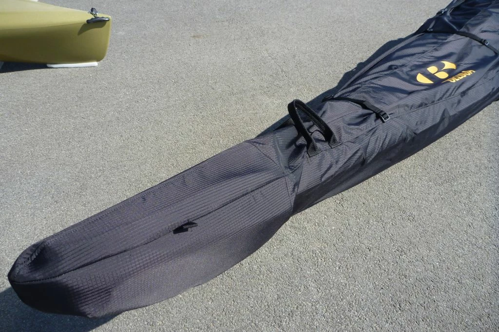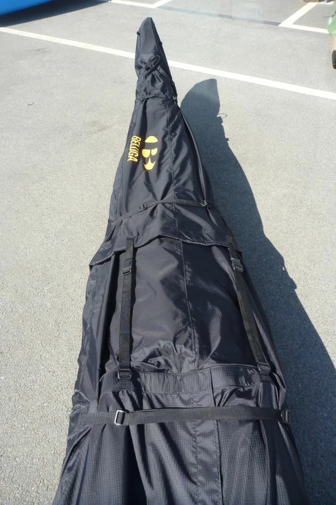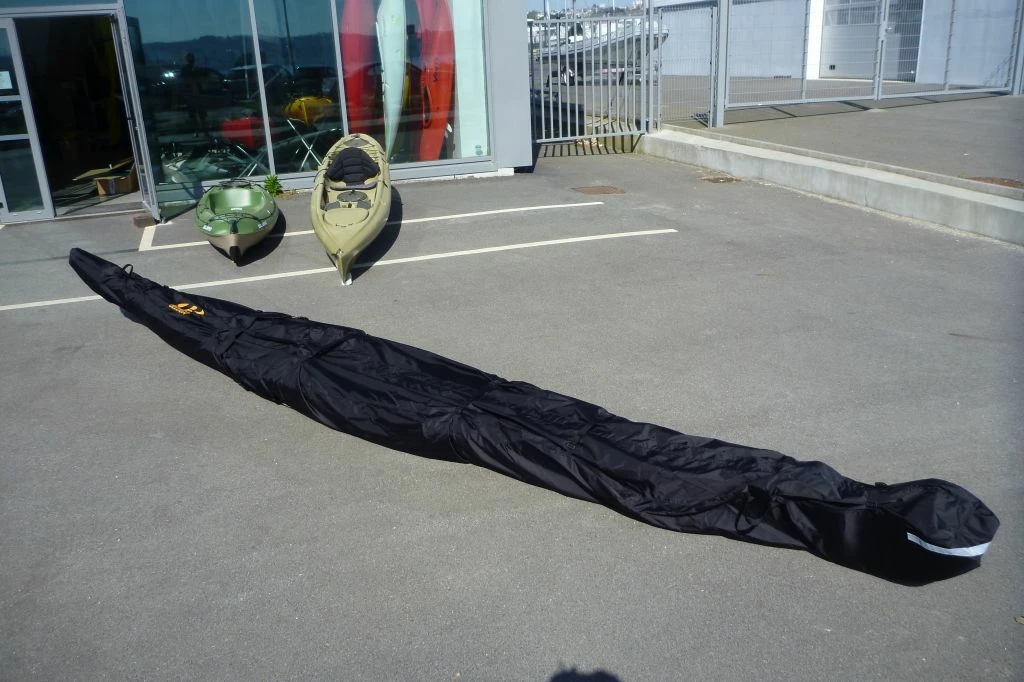 la housse est réalisée dans un tissu Nylon Rip Stop 210 deniers, une fermeture à glissière sur la moitié de la housse permet la fermeture de la housse et des sangles permettent de la serrer sur le kayak pour éviter que le tissu ne batte pendant le transport.
