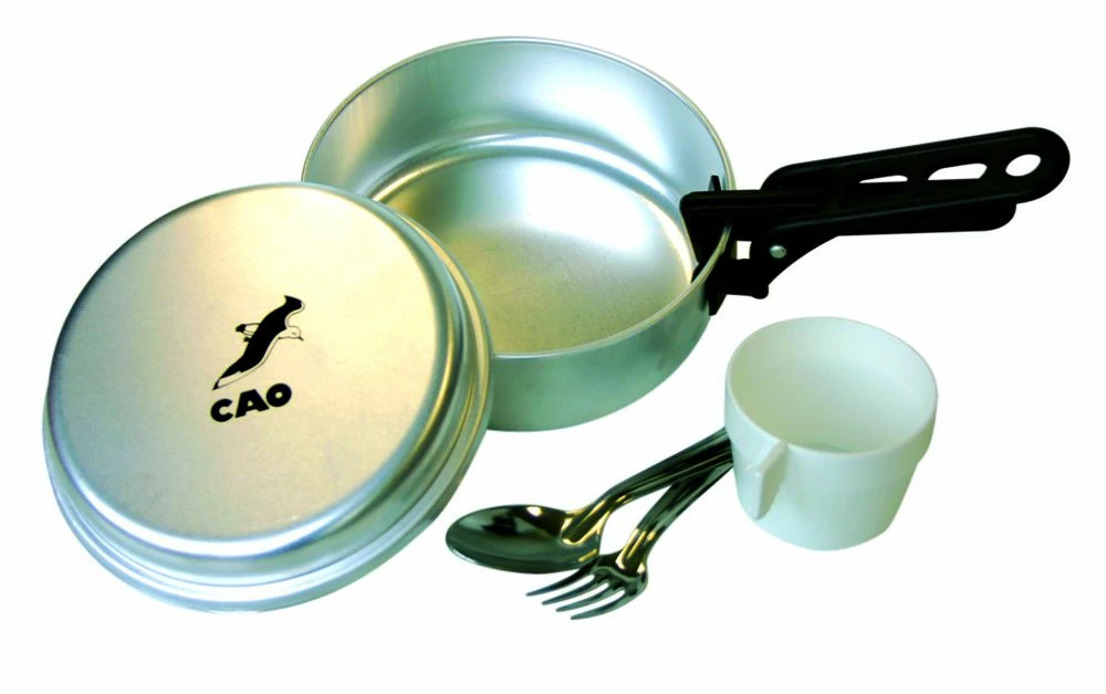 Popote aluminium 1 personne comprenant : 1 faitout diam. 165 mm, 1 poêle diam. 170 mm, 1 cuillère, 1 fourchette, 1 quart plastique, 1 pince preneuse, 1 sangle.