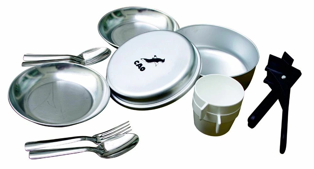 Popote aluminium 2 personnes comprenant : 1 faitout diam. 165 mm, 1 poêle diam. 170 mm, 2 assiettes alu diam. 160 mm, 2 cuillères, 2 fourchettes, 2 quarts plastique, 1 pince preneuse, 1 sangle.