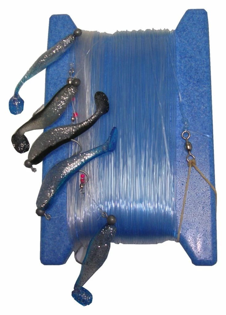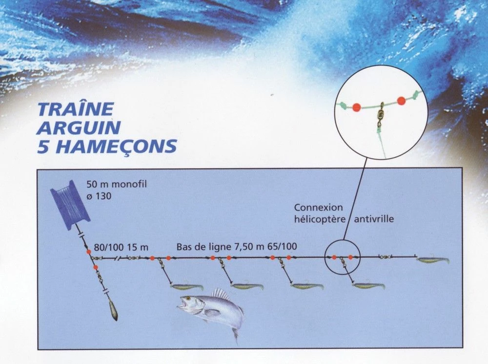 La traîne arguin est montée avec 5 kershad.Il sont d’extraordinaires leurres à bars.Leurs mouvements en traîne sont analogue à un vif en fuite.Ils émettent des basses fréquences qui attirent le bar de loin.Il faud équiper la ligne d’un plomb de 300 gr à 1 kg sur cassant, afin de pêcher bien au fond.Sur les chasses d’oiseaux, un lest de 200 gr peut suffire, le bar venant chasser en surface.Sur des petits fonds accidentés, le plomb peut être remplcé par un buldo afin de pêcher juste sous la surface.